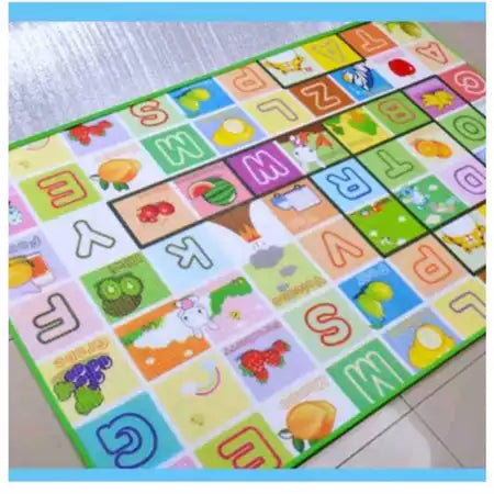 Desenhos coloridos com animais, letras e números incentivam os primeiros passos, brincadeiras e a descoberta de novos estímulos.